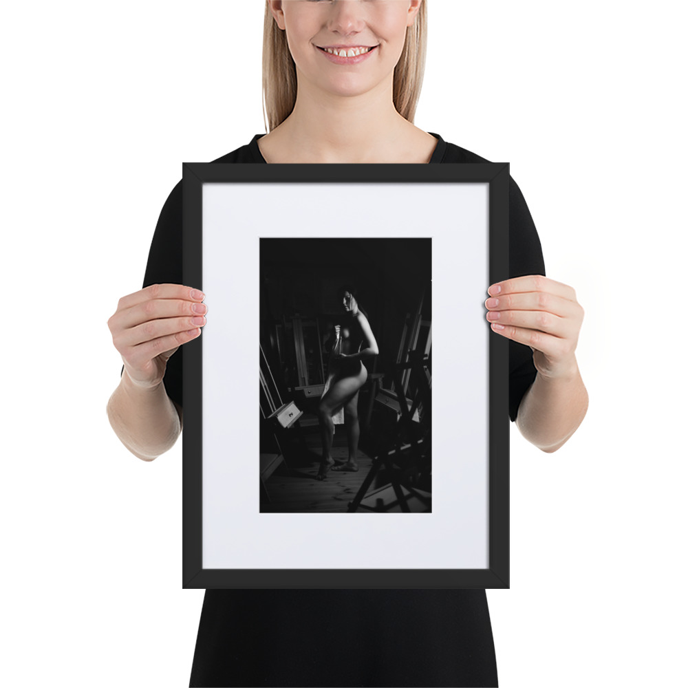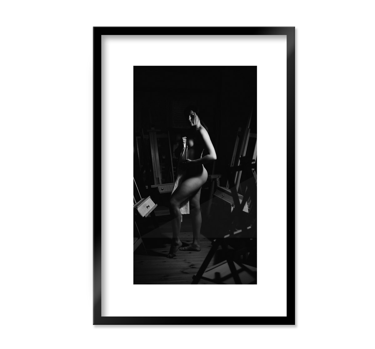 Licht und Schatten im Atelier. Schwarz/weiss Fotografie mit monochrom highlight und verdecktem Akt.