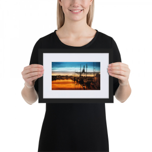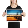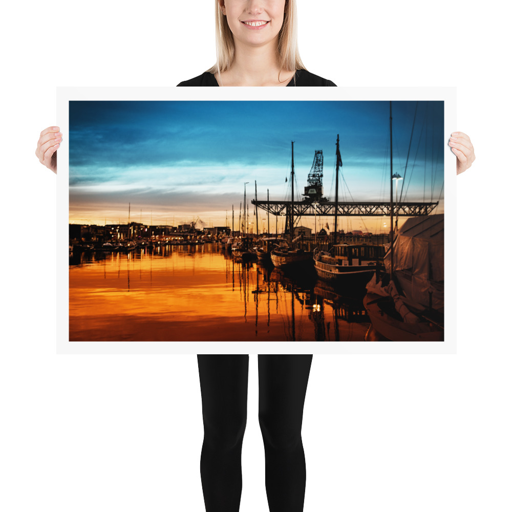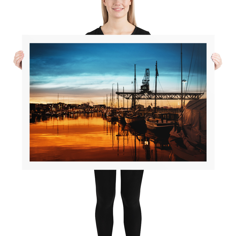 Der Rostocker Stadthafen mit Sonnenuntergang Kunst- und Fotodruck mit Passepartout
