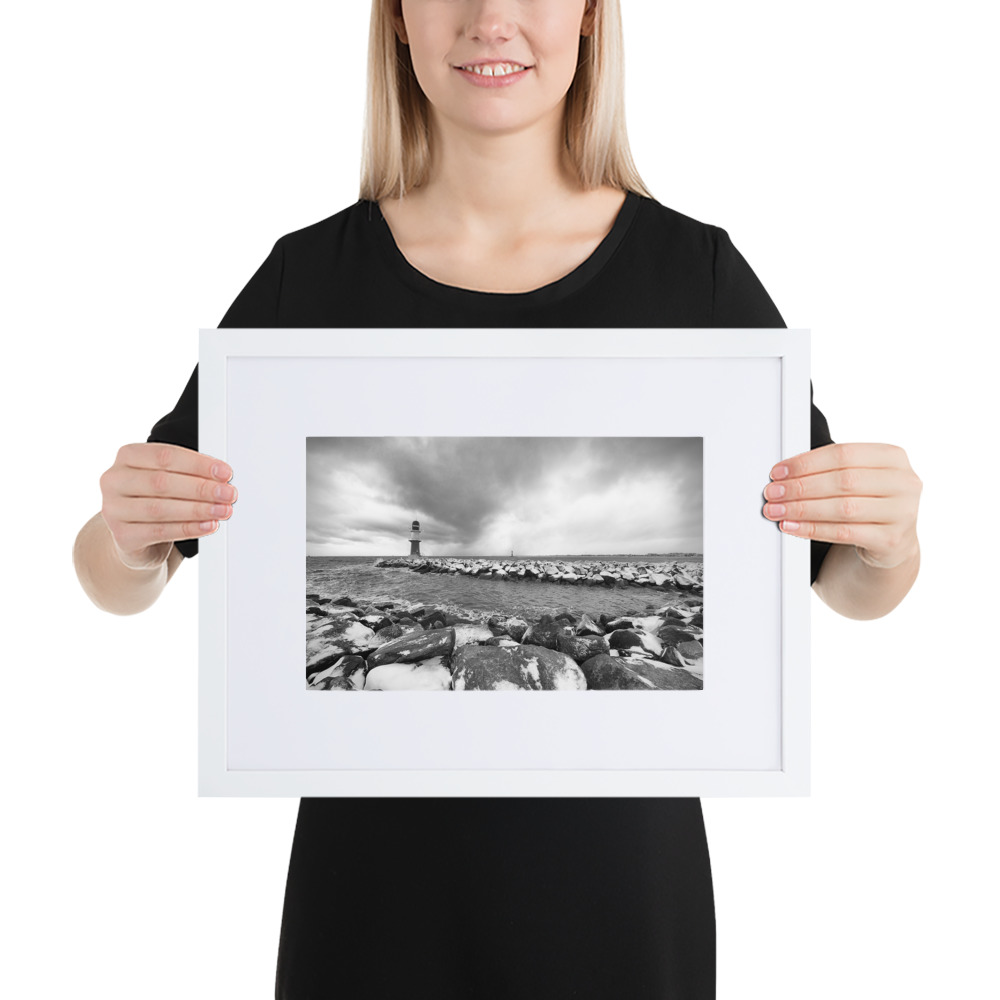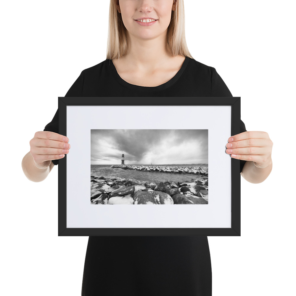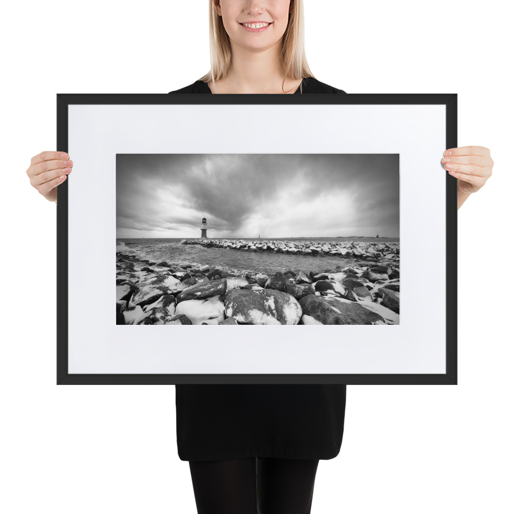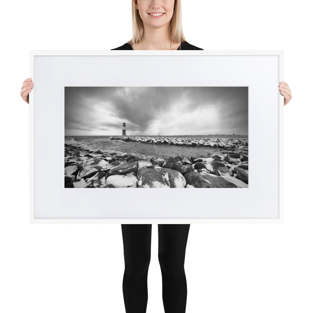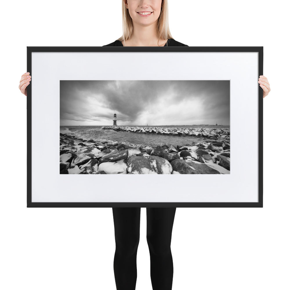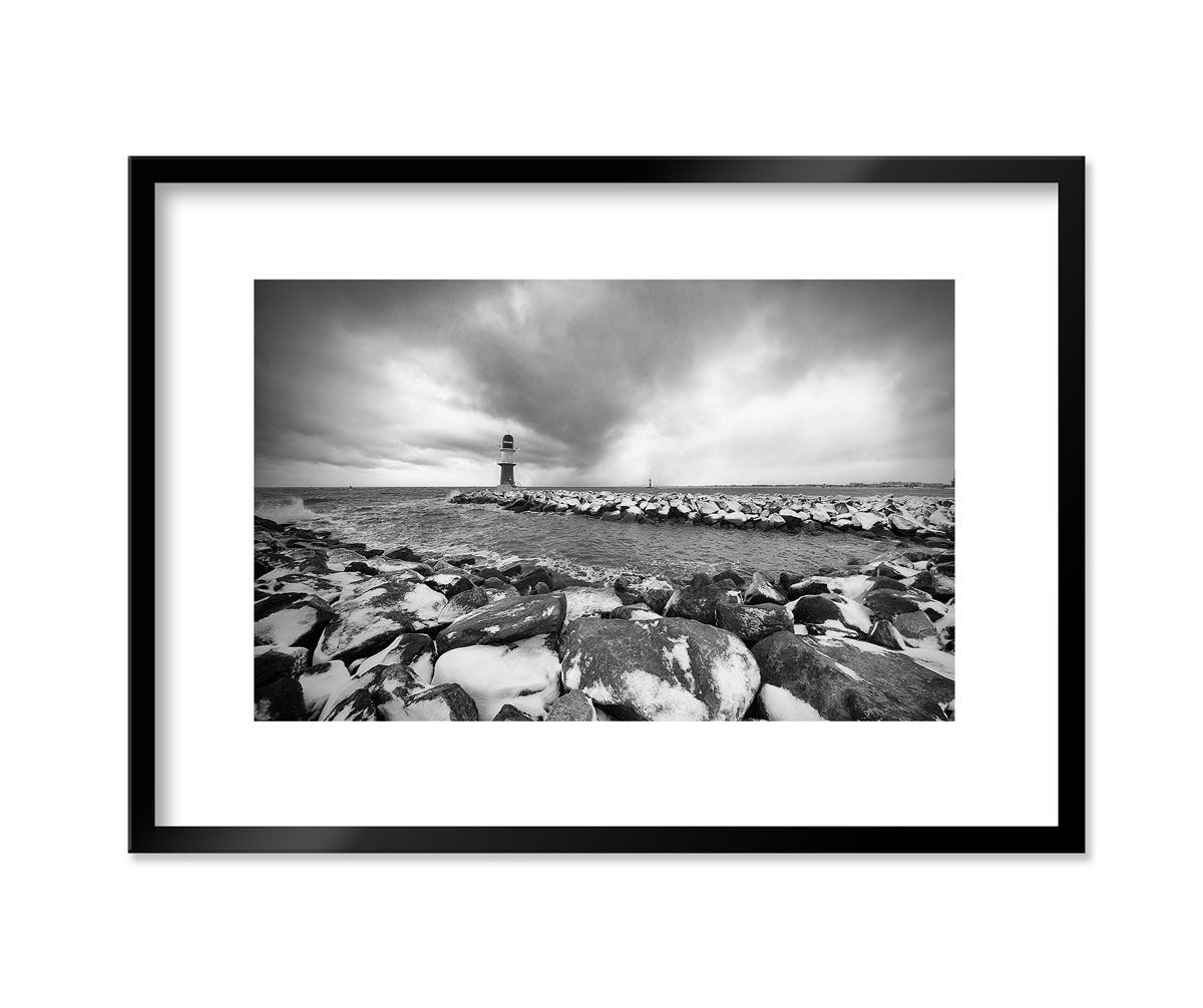 Molenfeuer Rostock Warnemünde s/w im Winter, gerahmt mit Passepartout